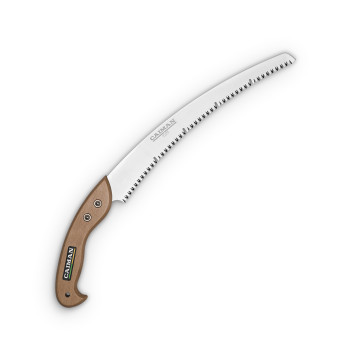 Ручная ножовка CAIMAN CA-350C - профессиональная модель с пильным полотном изогнутой формы в виде дуги и U-образными выемками. Это снижает усилие, особенно при пилении высоко расположенных веток. Традиционная приятная наощупь деревянная рукоятка обеспечивает комфорт при работе.